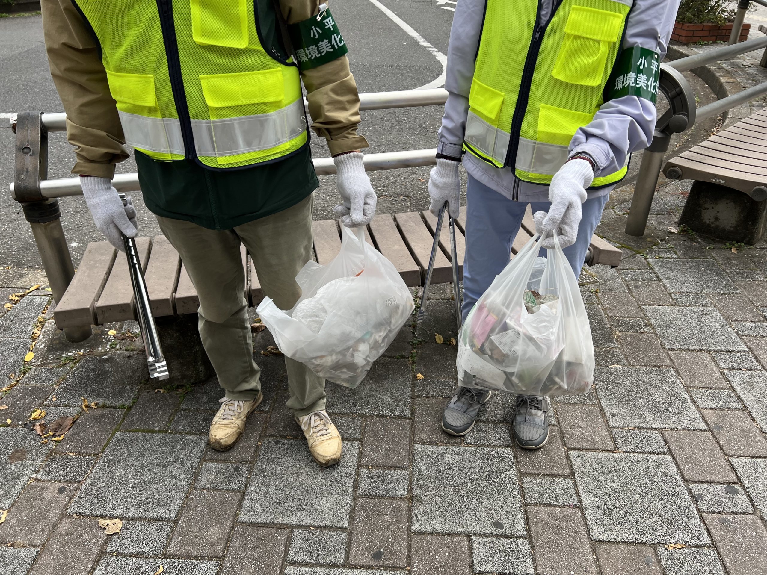 朝8時半ごろ新小平駅の改札を出ると、駅前では黄色いチョッキのようなユニホーム姿、腕には「小平市環境美化指導員」と書かれた腕章を付けた方々がゴミ取りトングで拾ったゴミをビニール袋に入れて回収されているところでした。