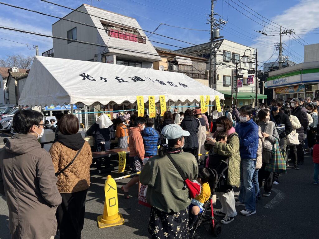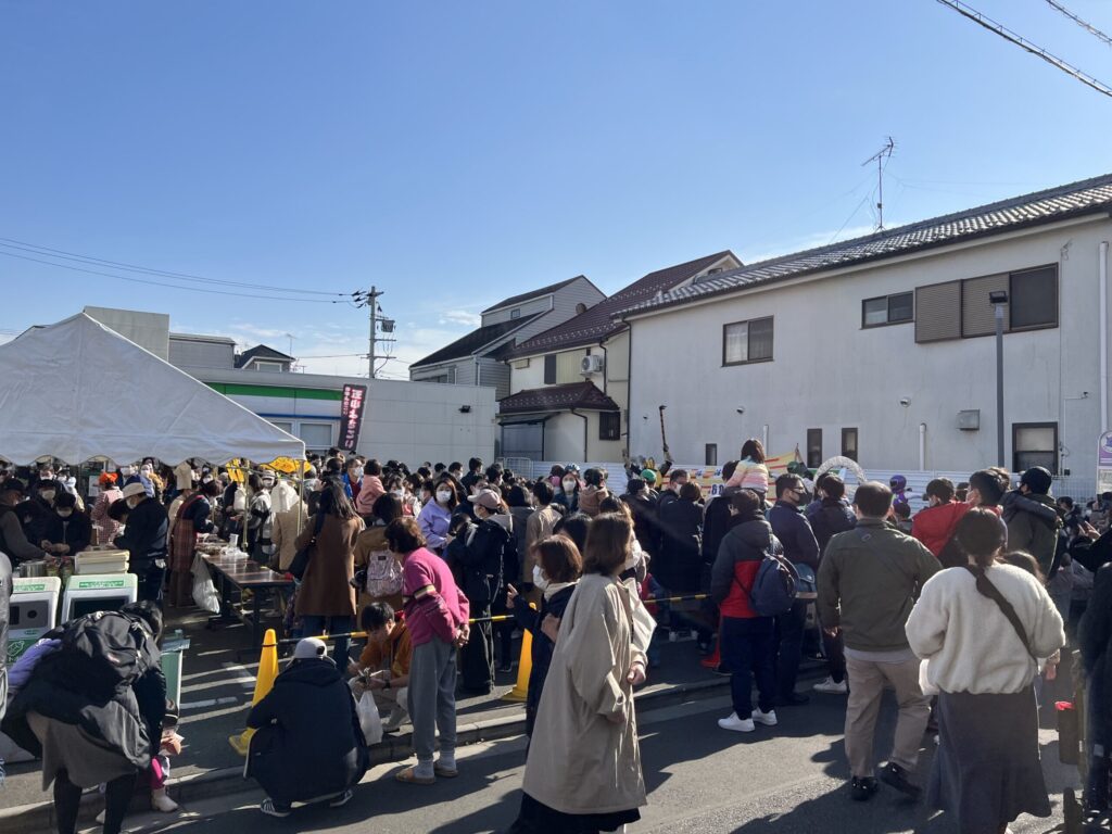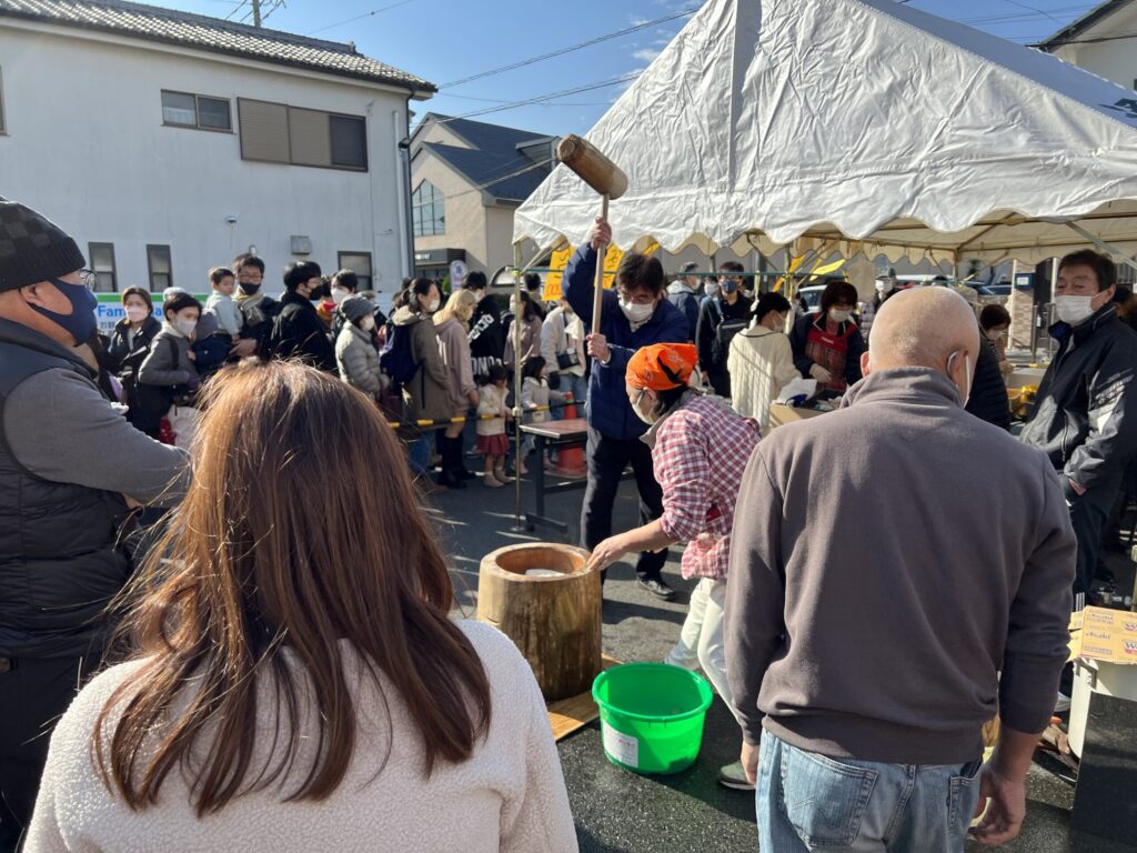 開始時間の午前11時前に着くと、すでにもちつきは始まっていて、つきたての餅が売られているテントの前には長蛇の列が。