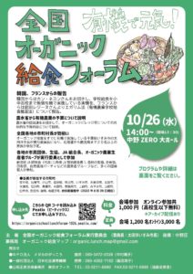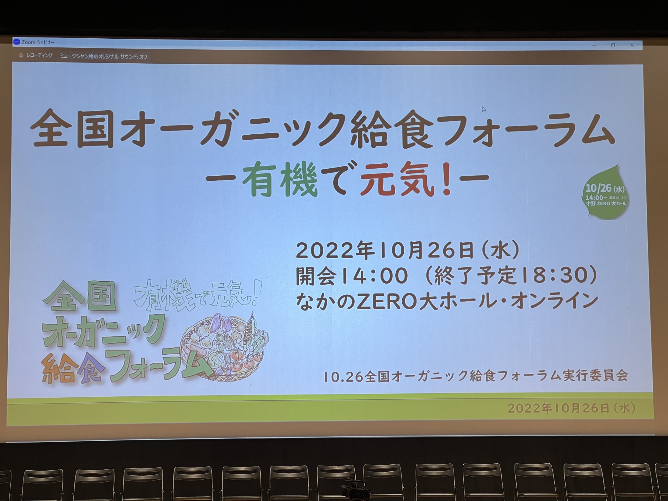 昨日は中野ZERO大ホールで行われた「全国オーガニック給食フォーラム」に参加してきました。「オーガニック給食」とは有機(オーガニック)栽培(化学合成された肥料と農薬の不使用および遺伝子組み換え技術を利用せず、環境への負荷をできる限り低減した栽培方法)や自然栽培(土を耕さず、除草せず、肥料と農薬を使用せず栽培する方法)などの農法で栽培された農産物を積極的に取り入れた給食の総称です。