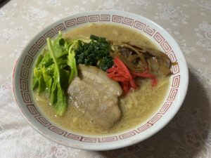 元々付いているトッピングのメンマ、チャーシューにネギ、小松菜、ショウガを付け足して完成。