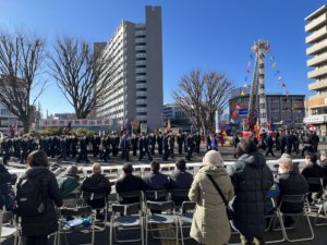 今年で創設60周年を迎える小平市消防団が3年ぶりに、小平駅南口ロータリーにて消防団出初式を実施しました。