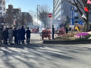 出初式は午前10時からでしたが、すでに午前6時半過ぎには消防団の人たちが集まりだしてテントやテーブル、看板などの準備が始まりました。そして、午前8時にはロータリーの外にバスやタクシーの臨時乗り場を設置、他の車両が一切入れなくしてから消防車などを搬入していました。