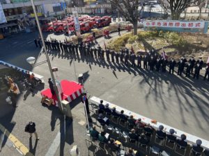 今年で創設60周年を迎える小平市消防団が3年ぶりに、小平駅南口ロータリーにて消防団出初式を実施しました。