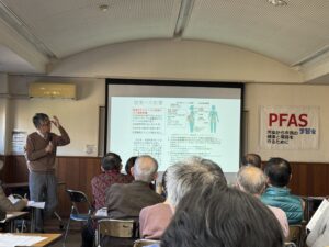 多摩地域では井戸水を水源とする一部の浄水所でこのPFASが検出されたため、2023年に市民団体が650人の血液を検査した結果、335人でアメリカの健康リスクの基準を超えていたことが分かりました。血液中濃度が高かったのは国分寺市、次いで立川氏、小平市は6番目に高い数値を示しました。