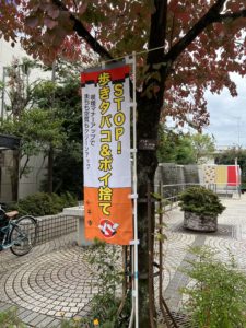 今日の朝7時過ぎぐらいから、一橋学園駅北口の隣にある「学園駅前公園」に人がぞろぞろと集まってきたので何かなと見ているとのぼりを立て始めました。そののぼりを見てみると「STOP! 歩きタバコ&ポイ捨て」「喫煙マナーアップでまちも空気もクリーンアップ(小平市)」と書いてありました。