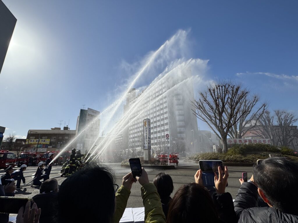 消防少年団含め、消防団が空高く一斉に放水した、その光景はまさに圧巻の一言でした。