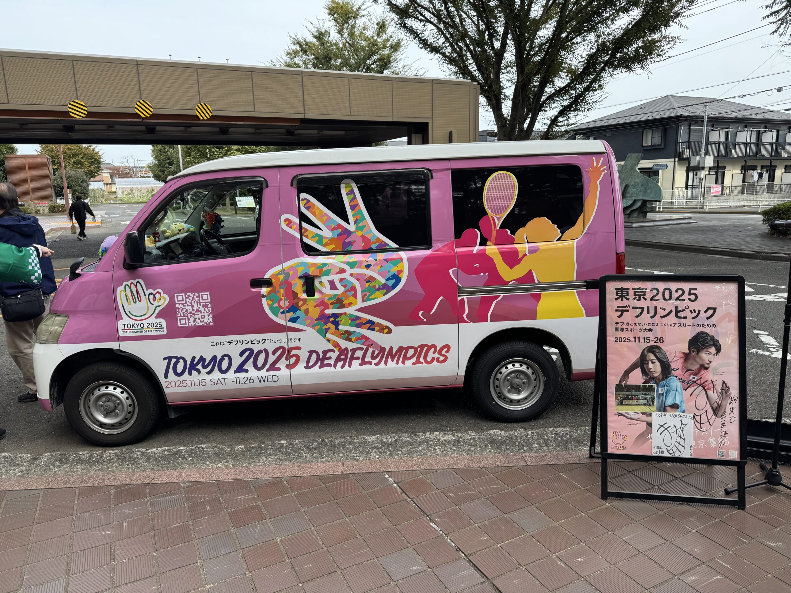 実は、11月5日、東京2025デフリンピックを広報するため、全国キャラバン活動を展開していた一般財団法人全日本ろうあ連盟のキャラバンカーが、小平市役所にも巡回して広報活動を行いました。当日はキャラバンカー展示、デフリンピックのメダル(レプリカ)展示、小平市聴力障害者協会等によるバッジ等の配布や、小林市長による挨拶と参加者との記念撮影などが行われました。